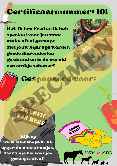 Een schonere wereld is al geweldig, maar het wordt nog beter: de volledige opbrengst van deze actie gaat naar de 5050ShopSDB, die zich 100% inzet voor dierendoelen.